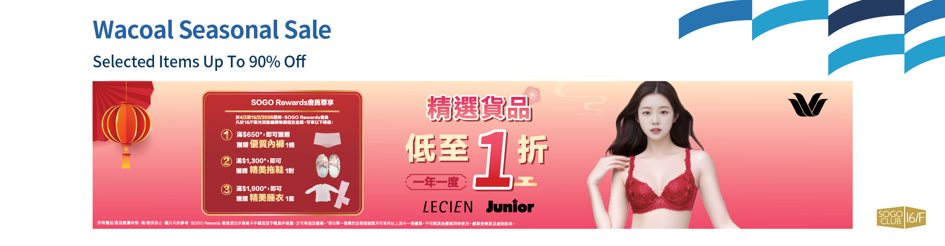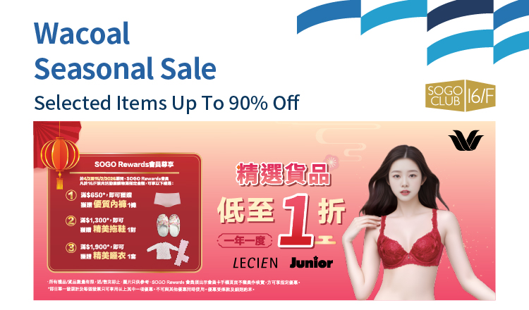 From 4/2/2025 until 15/2/2026, Wacoal Seasonal Sale is held at SOGO CLUB 16/F, SOGO Causeway Bay store. Come and enjoy.
