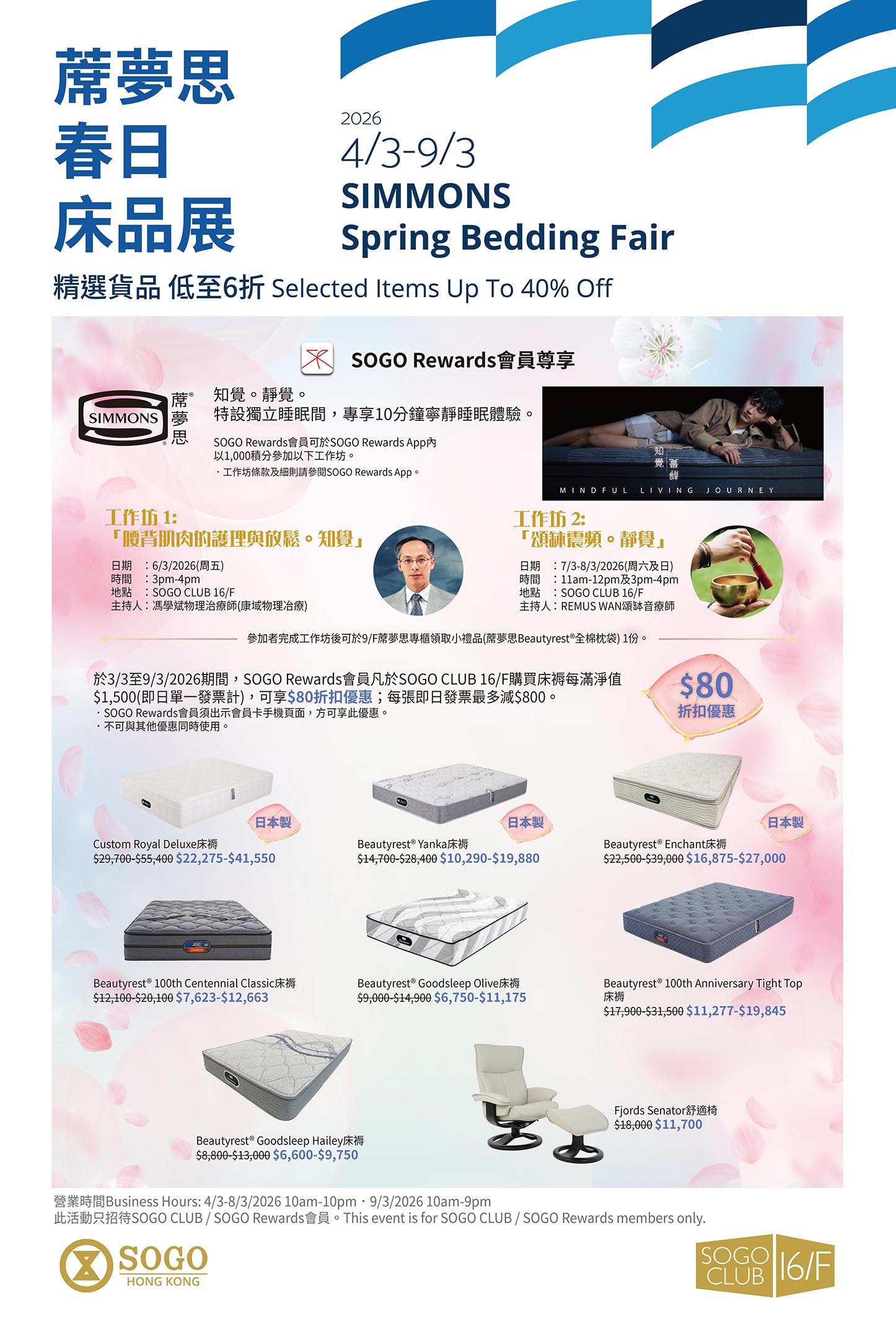 From 4/3/2026 until 9/3/2026, SIMMONS Spring Bedding Fair is held at SOGO CLUB 16/F, SOGO Causeway Bay store. Come and enjoy.