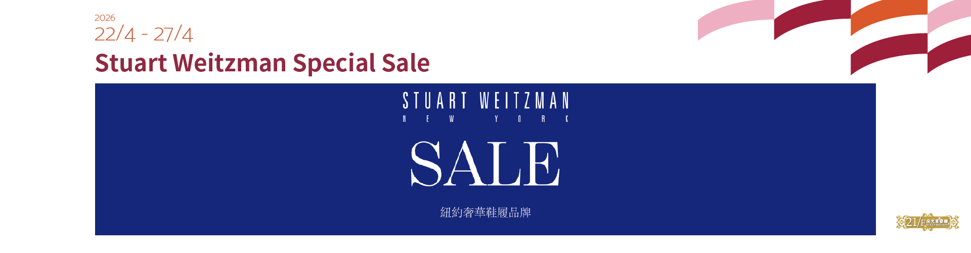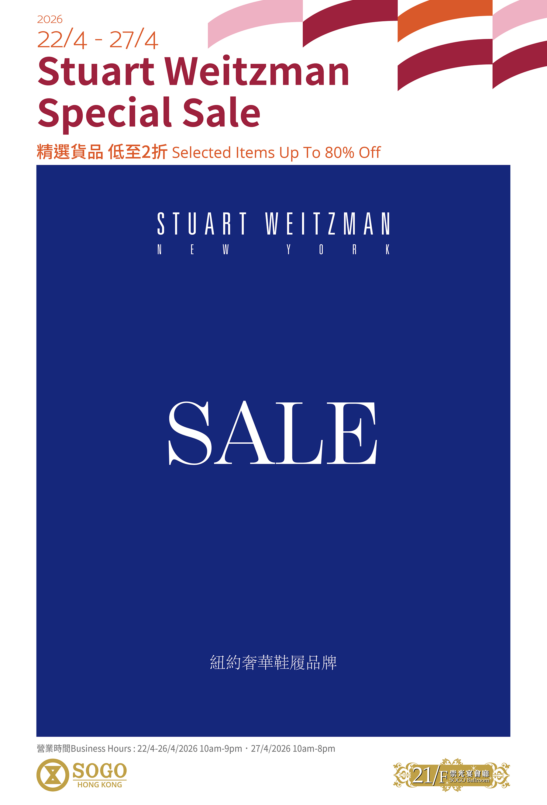 From 22/4/2026 until 27/4/2026, Stuart Weitzman Special Sale will be held at 21/F SOGO Ballroom, SOGO Causeway Bay store. Come and enjoy up to 80% off on selected items.
