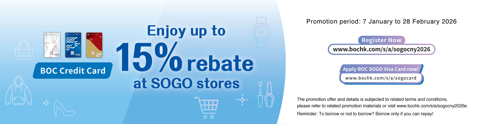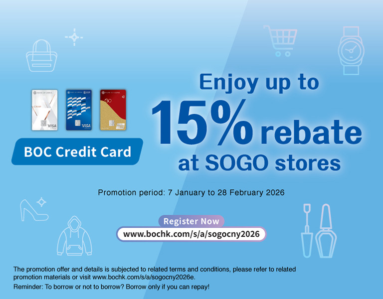 • “SOGO New Year Spending Reward up to 5% Rebate” spending program (Promotion Period: 7/1 - 28/2/2026), for accumlated purchases of $5,000 or above at SOGO Causeway Bay Store, Kai Tak Store or eStore, Designated BOC Credit Card cardholders can enjoy 3% rebate with a maximum of $300 rebate while BOC SOGO Visa Card can enjoy 5% rebate with a maximum of $400 rebate. Registration quota is limited and first-come-first served.