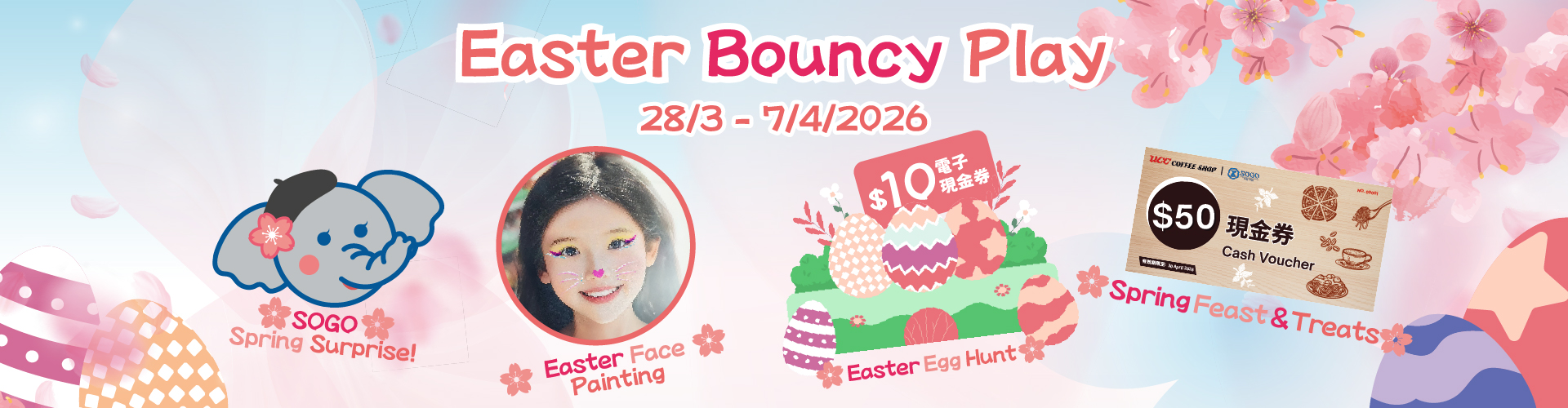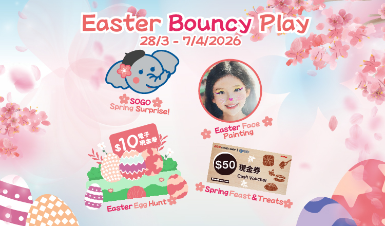 From 1/4 until 7/4/2026, upon completion of 3 simple steps at SOGO Causeway Bay Store or SOGO Kai Tak Store, SOGO Rewards members can receive a $10 Easter eCash Coupon*.