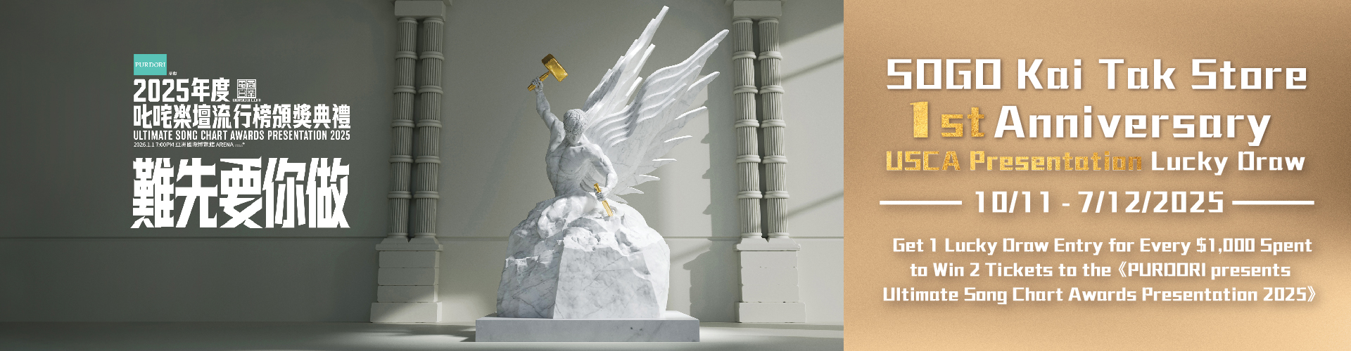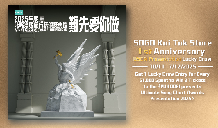 SOGO Rewards members who spend every $1,000 in a single net purchase at SOGO Kai Tak Store (excluding SOGO Gift Certificates) can earn 1 entry into the "SOGO Kai Tak Store’s 1st Anniversary USCA Presentation Lucky Draw", with a chance to win 2 tickets to the 《PURDORI presents Ultimate Song Chart Awards Presentation 2025》. The more you buy, the more entries you earn!