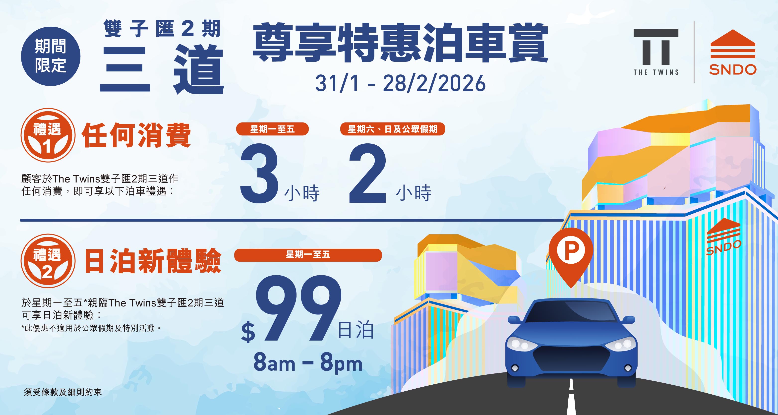 Customers who visit and park at SNDO in The Twins Tower II from Monday to Friday* can enjoy the $99 day parking new experience: