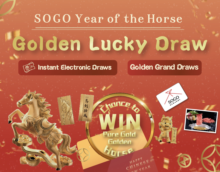 From 4/2 to 24/2/2026, SOGO Rewards members who spend the designated net amount on a single invoice at SOGO Causeway Bay Store or Kai Tak Store (excluding SOGO Gift Certificates) will enjoy double winning opportunities in the "SOGO Year of the Horse Golden Lucky Draw", with a chance to win abundant prizes.