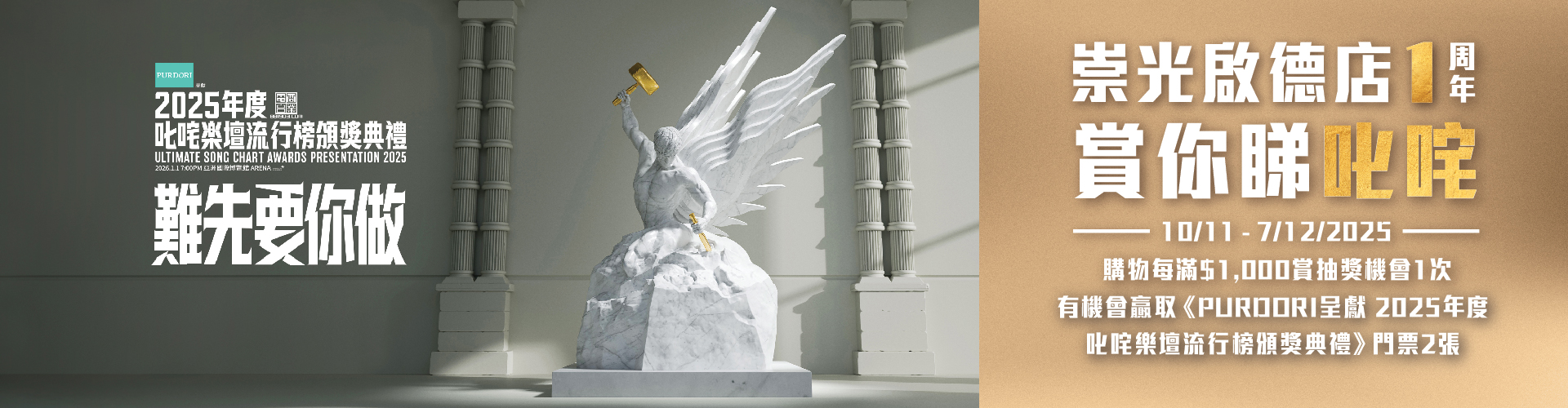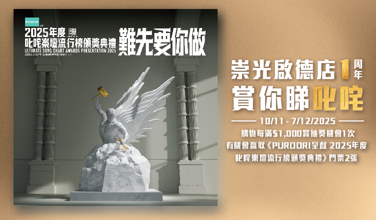 SOGO Rewards會員凡於崇光啟德店單一購物每滿$1,000(不包括崇光購物禮券),即可賞《賞你睇叱咤》抽獎機會1次,有機會贏取《PURDORI呈獻 2025年度叱咤樂壇流行榜頒獎典禮》門票2張,多買多抽!