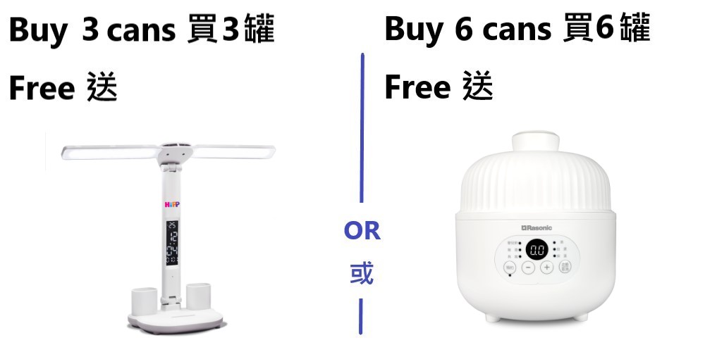 贈品優惠:凡於崇光網店購買3罐HiPP喜寶HMP有機奶粉2/3/4號,即可獲贈喜寶禮品檯燈1個(價值$299);或購買6罐,即可獲贈樂信迷你電子燉盅(0.8公升)1個(價值$398)。
